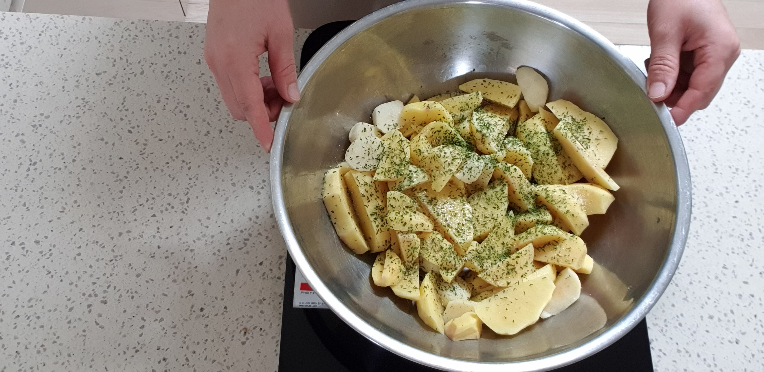 대야를 들어 반동을 주면 감자를 골고루 섞을 수 있어요.