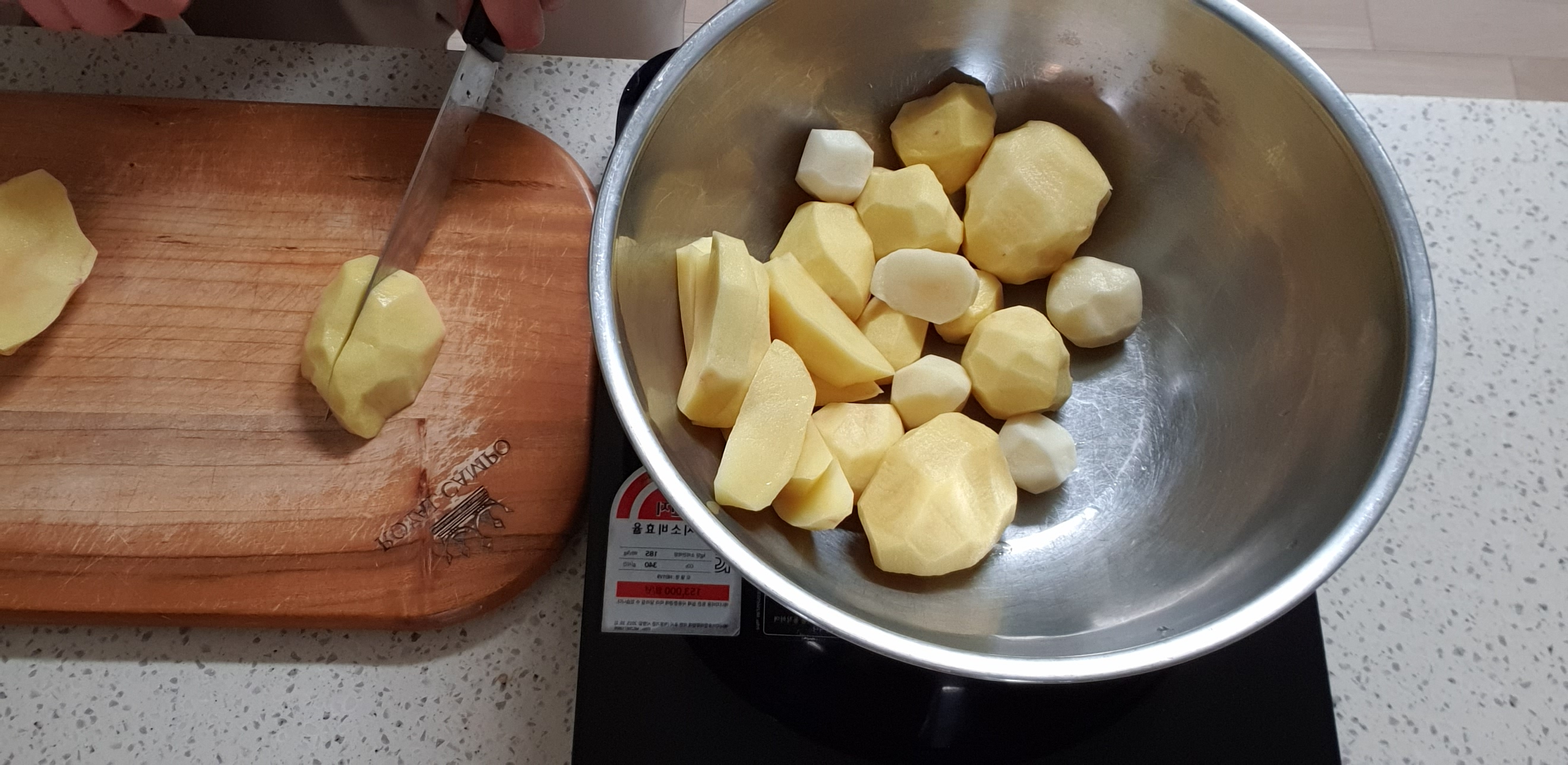 반으로 자른 감자를 반으로 나누고 썰어주고