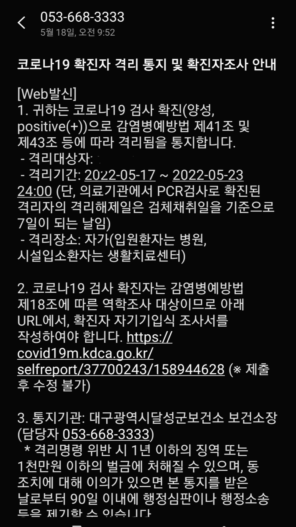 우선 위 사진처럼 관할 보건소에서 보내온 코로나19 확진자 격리 통지 및 확진자 조사 문자를 핸드폰에서 찾습니다.